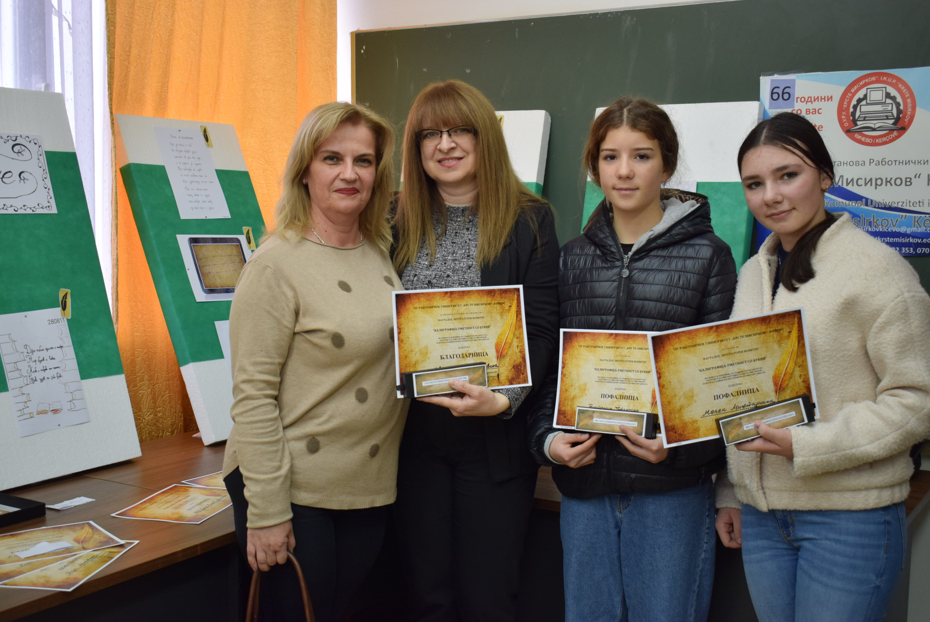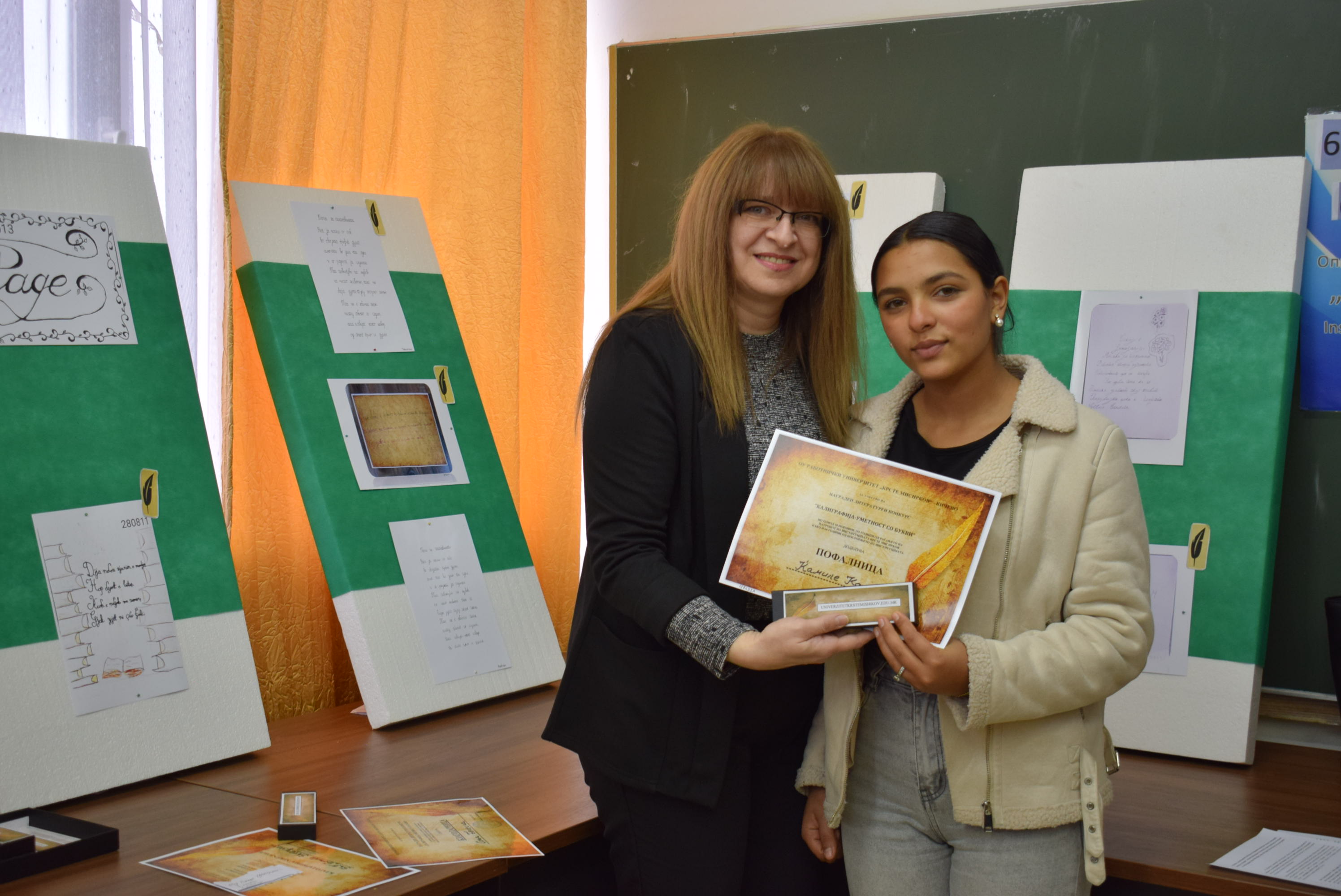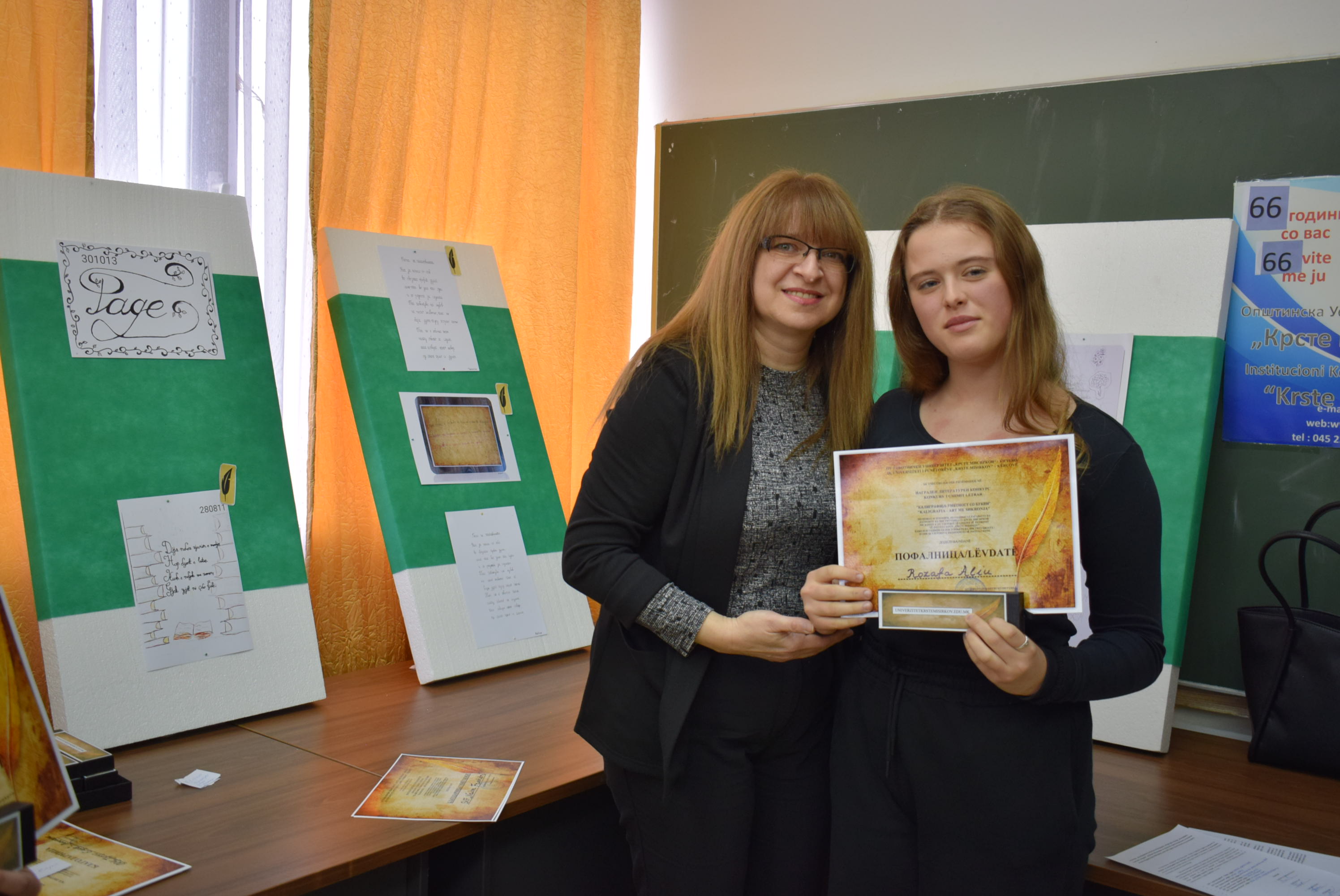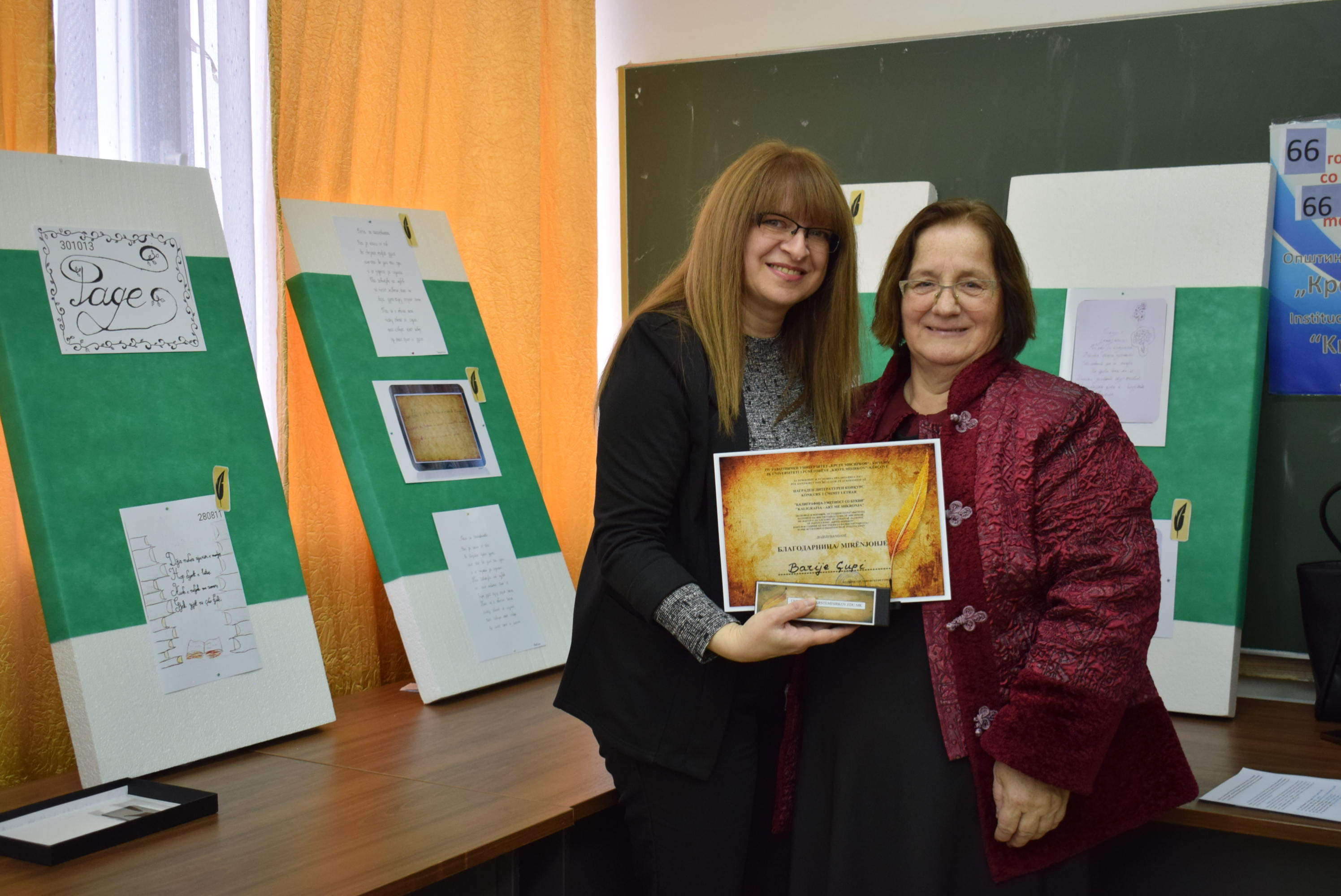 Çmimet dhe lëvdatat u dhanë për veprat më të mira të paraqitura në lidhje me konkursin letrar "Kaligrafia - Art me shkronja". Është një ndjesi e këndshme kur shikon veprat e shkruara me shkronja kaligrafike, të cilat shkruhen më mirë vit pas viti.Shumë faleminderit pjesëmarrësve, mentorëve dhe të gjithë të tjerëve që morën pjesë në këtë aktivitet, i cili ishte me rastin e 151-vjetorit të lindjes së patronit tonë Krste Misirkov, si dhe 66 vjet të ekzistencës së institucionit. Ekspozita do të jetë e hapur për vizitorët për 10 ditët e ardhshme të punës.