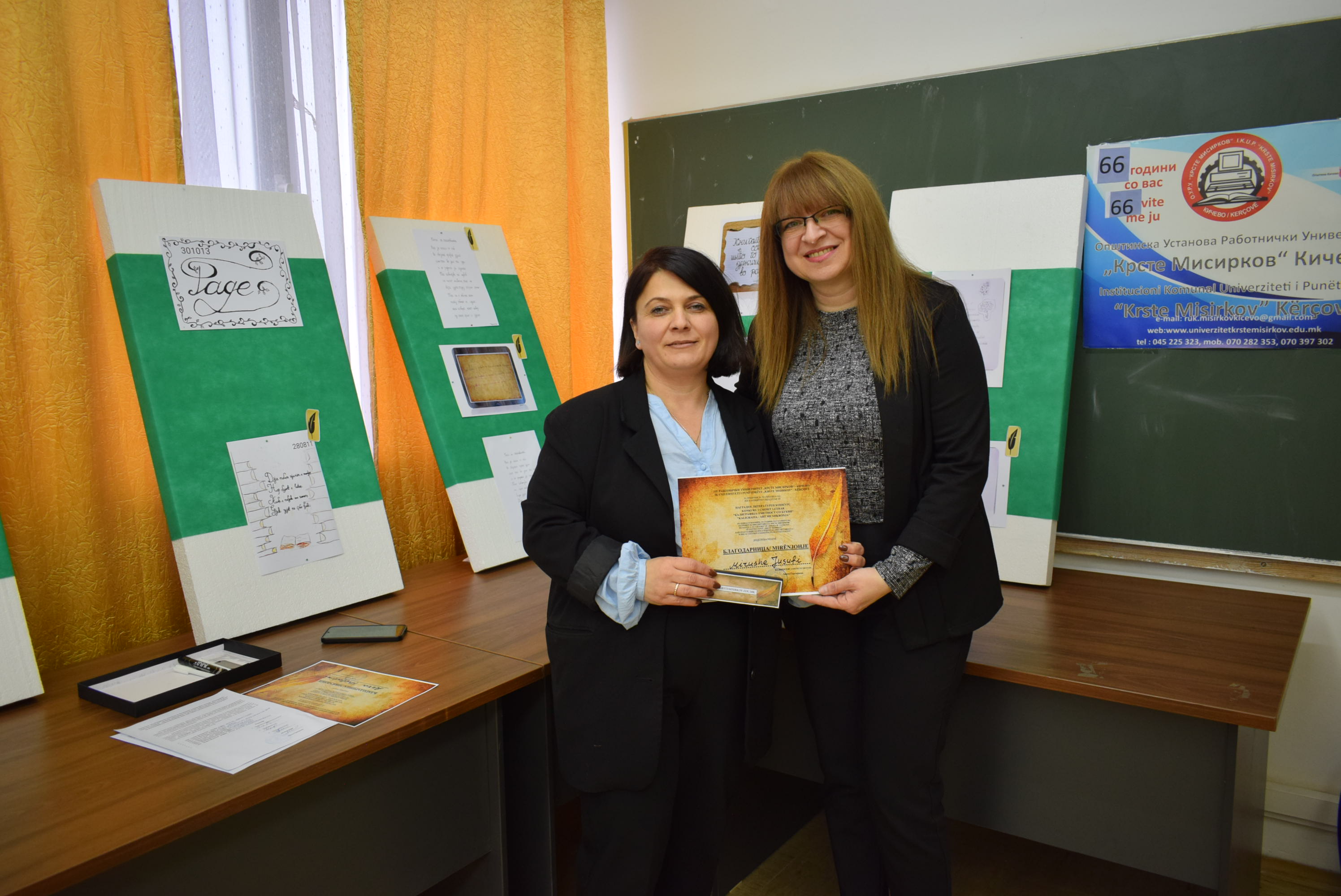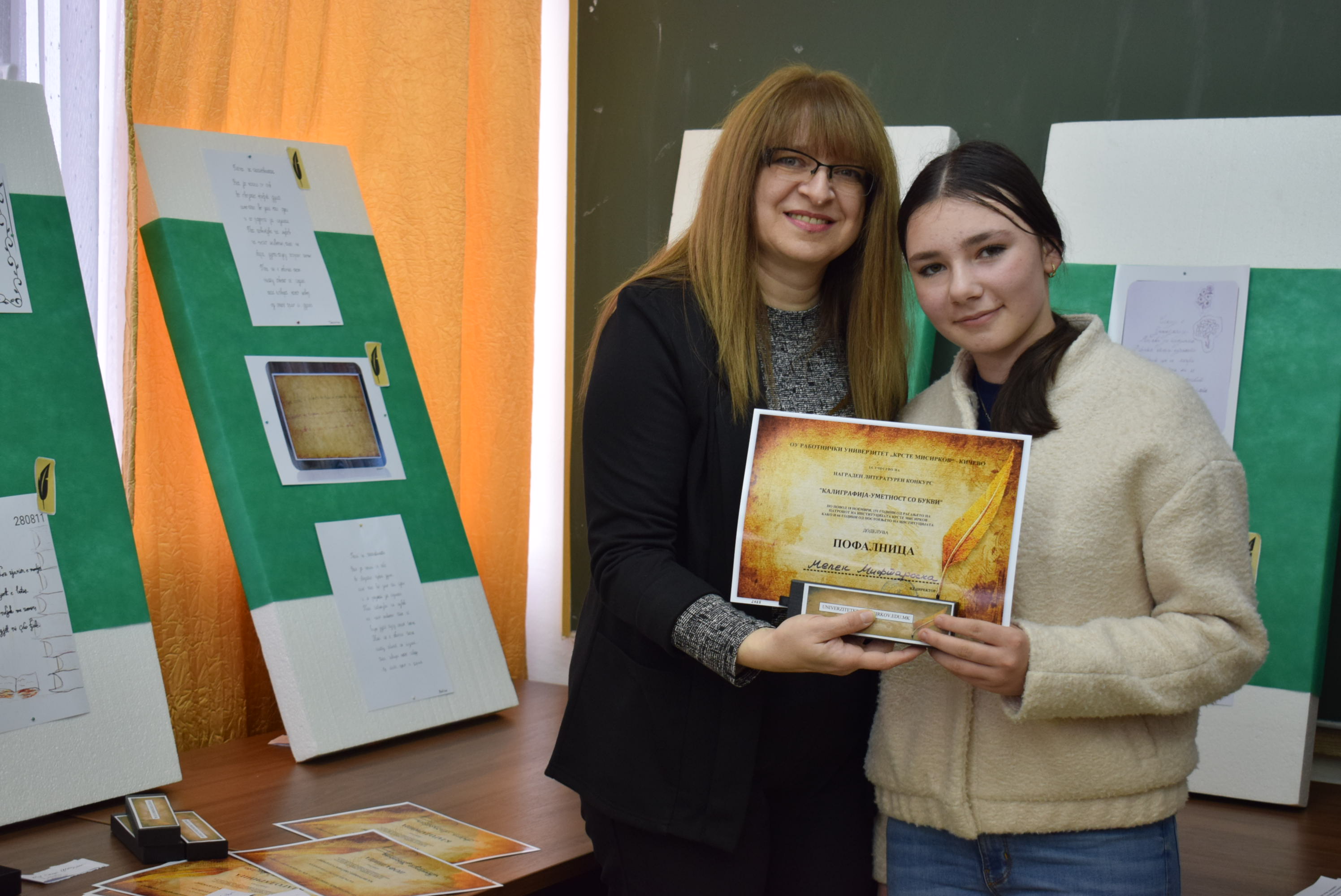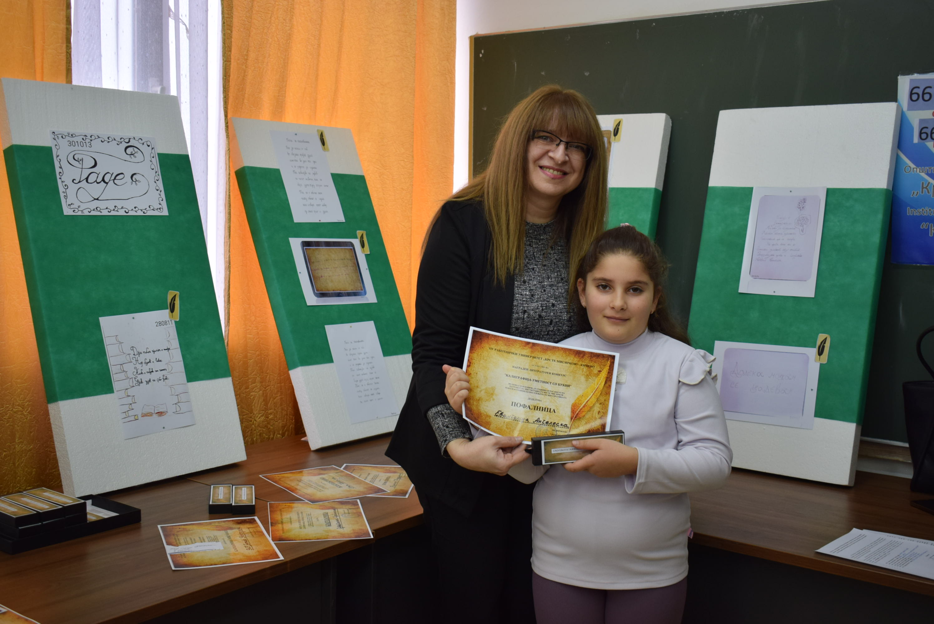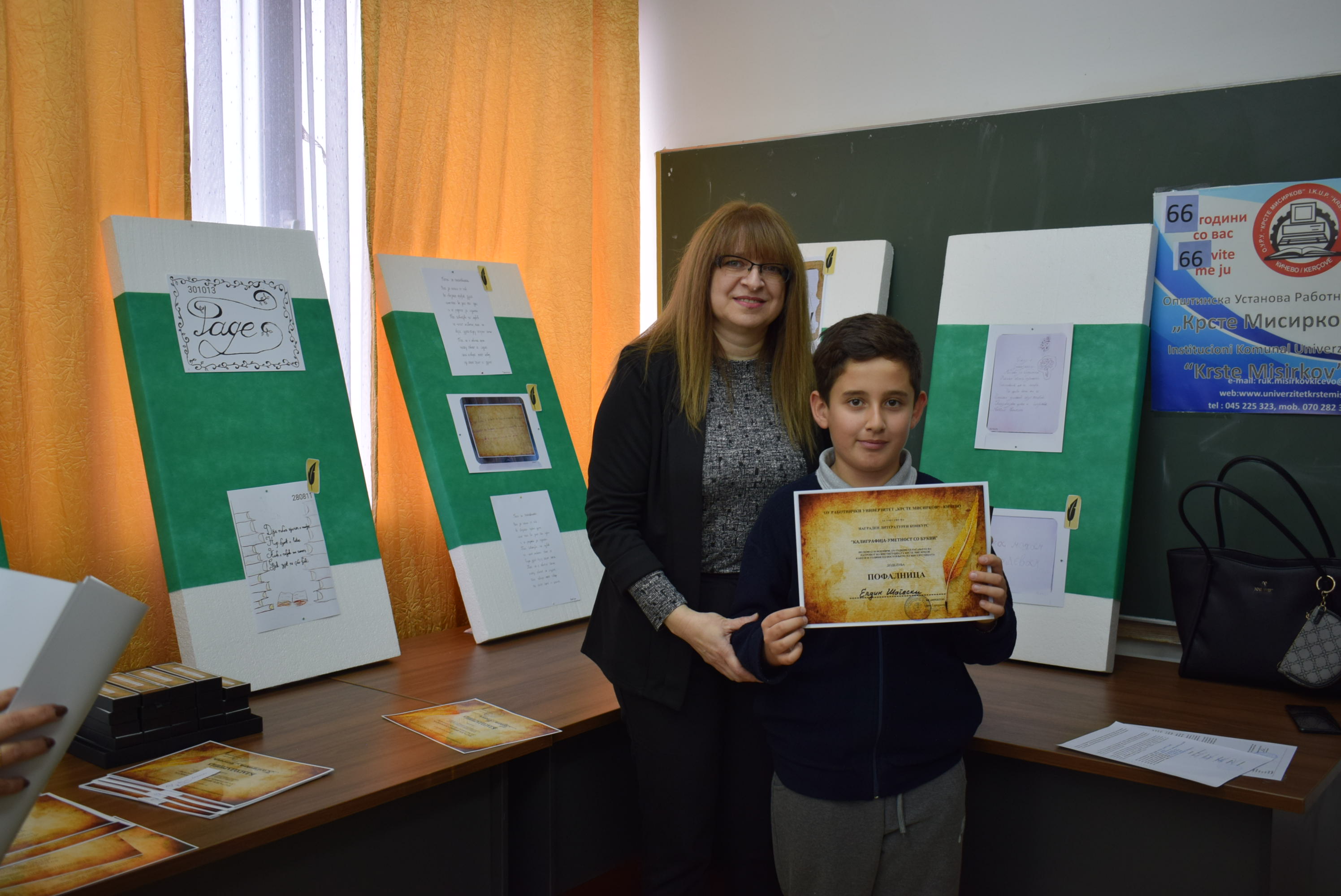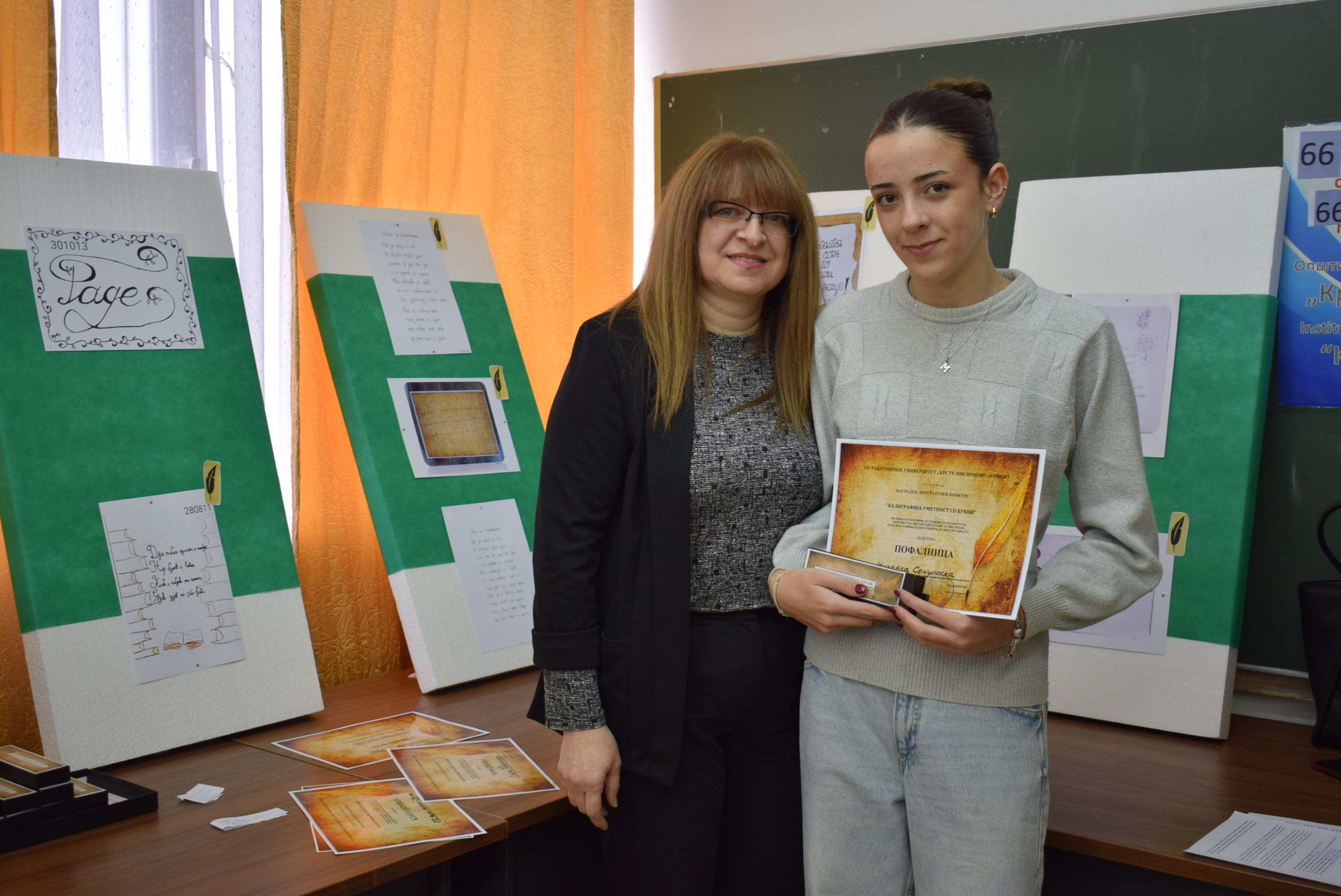Çmimet dhe lëvdatat u dhanë për veprat më të mira të paraqitura në lidhje me konkursin letrar "Kaligrafia - Art me shkronja". Është një ndjesi e këndshme kur shikon veprat e shkruara me shkronja kaligrafike, të cilat shkruhen më mirë vit pas viti.Shumë faleminderit pjesëmarrësve, mentorëve dhe të gjithë të tjerëve që morën pjesë në këtë aktivitet, i cili ishte me rastin e 151-vjetorit të lindjes së patronit tonë Krste Misirkov, si dhe 66 vjet të ekzistencës së institucionit. Ekspozita do të jetë e hapur për vizitorët për 10 ditët e ardhshme të punës.
