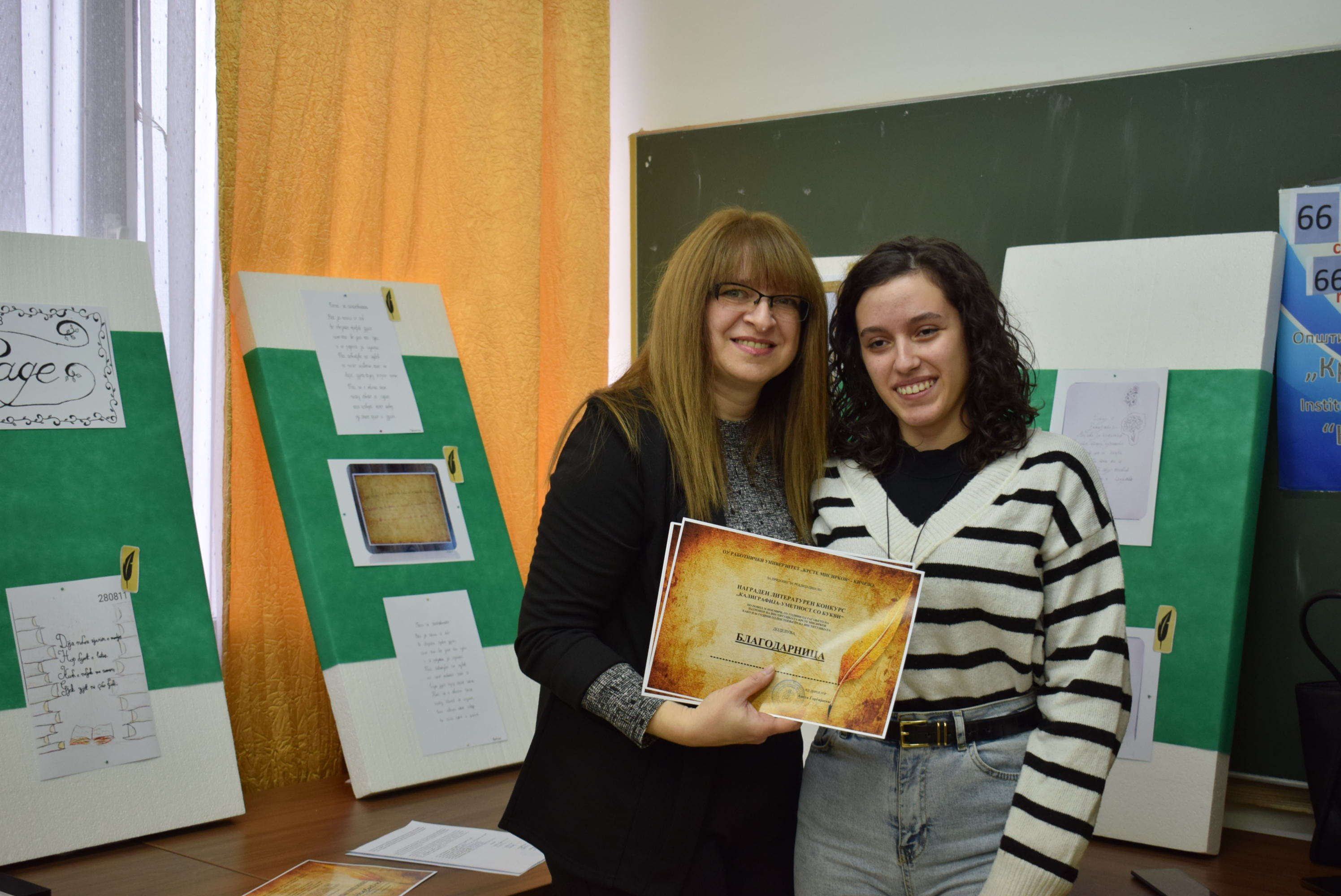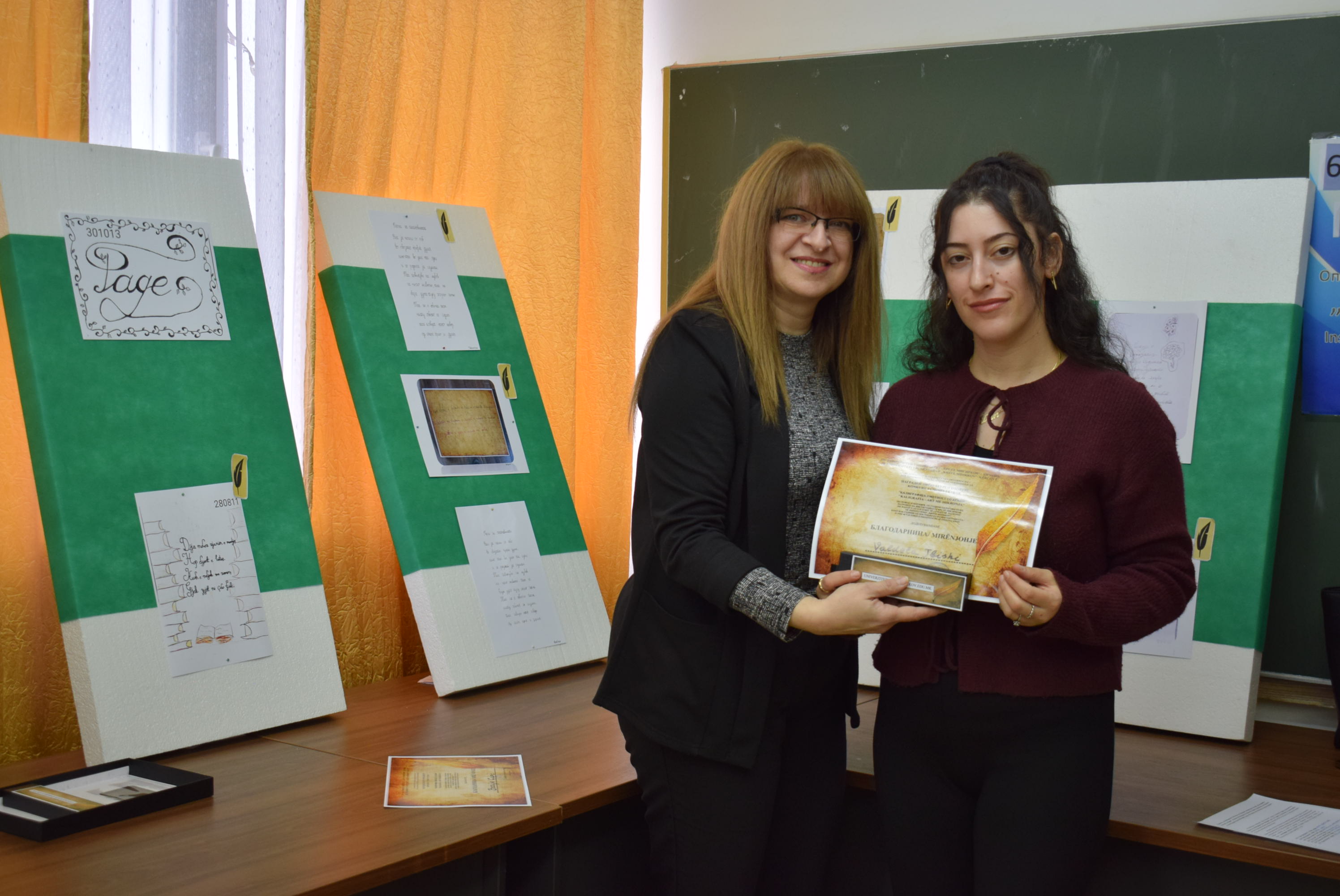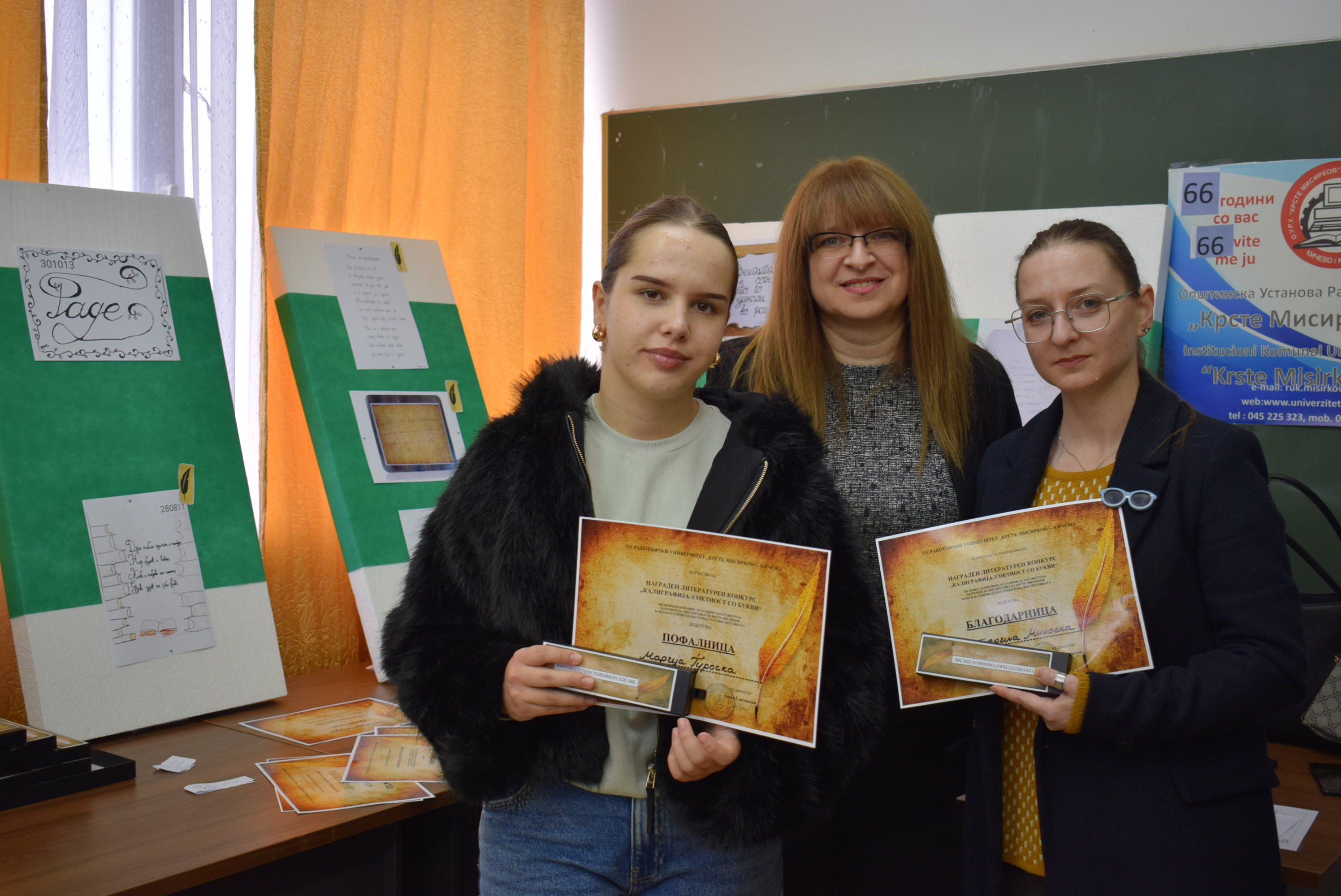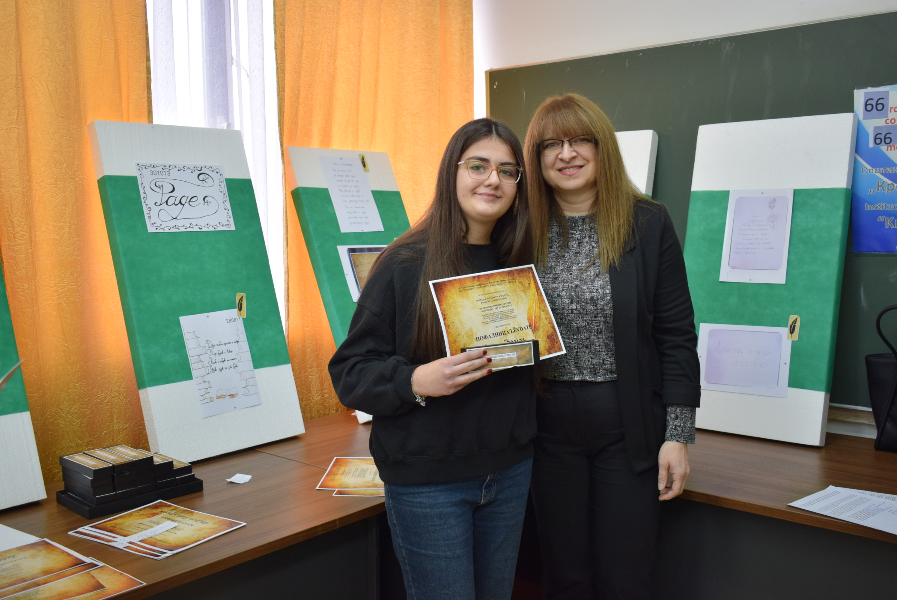Çmimet dhe lëvdatat u dhanë për veprat më të mira të paraqitura në lidhje me konkursin letrar "Kaligrafia - Art me shkronja". Është një ndjesi e këndshme kur shikon veprat e shkruara me shkronja kaligrafike, të cilat shkruhen më mirë vit pas viti.Shumë faleminderit pjesëmarrësve, mentorëve dhe të gjithë të tjerëve që morën pjesë në këtë aktivitet, i cili ishte me rastin e 151-vjetorit të lindjes së patronit tonë Krste Misirkov, si dhe 66 vjet të ekzistencës së institucionit. Ekspozita do të jetë e hapur për vizitorët për 10 ditët e ardhshme të punës.