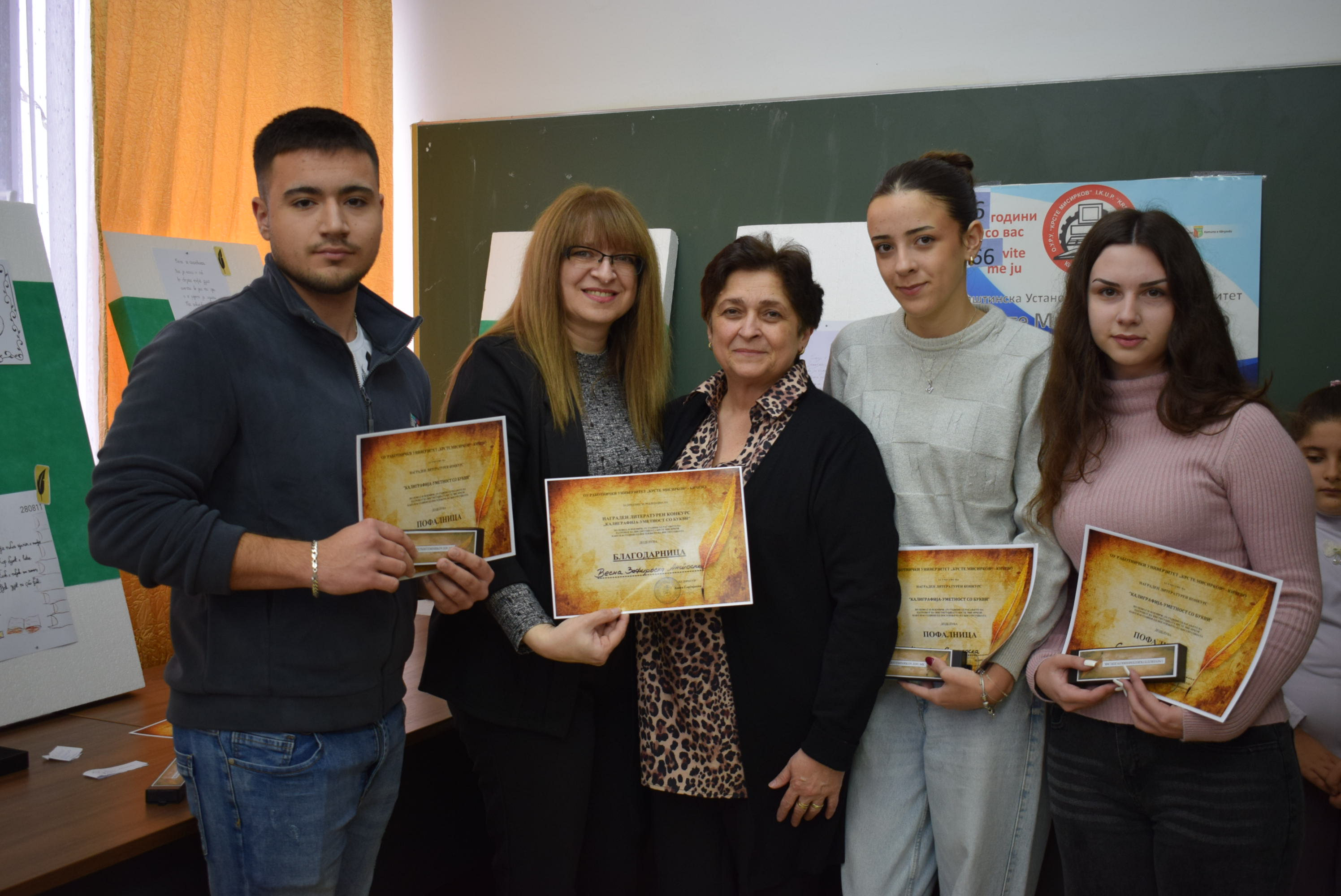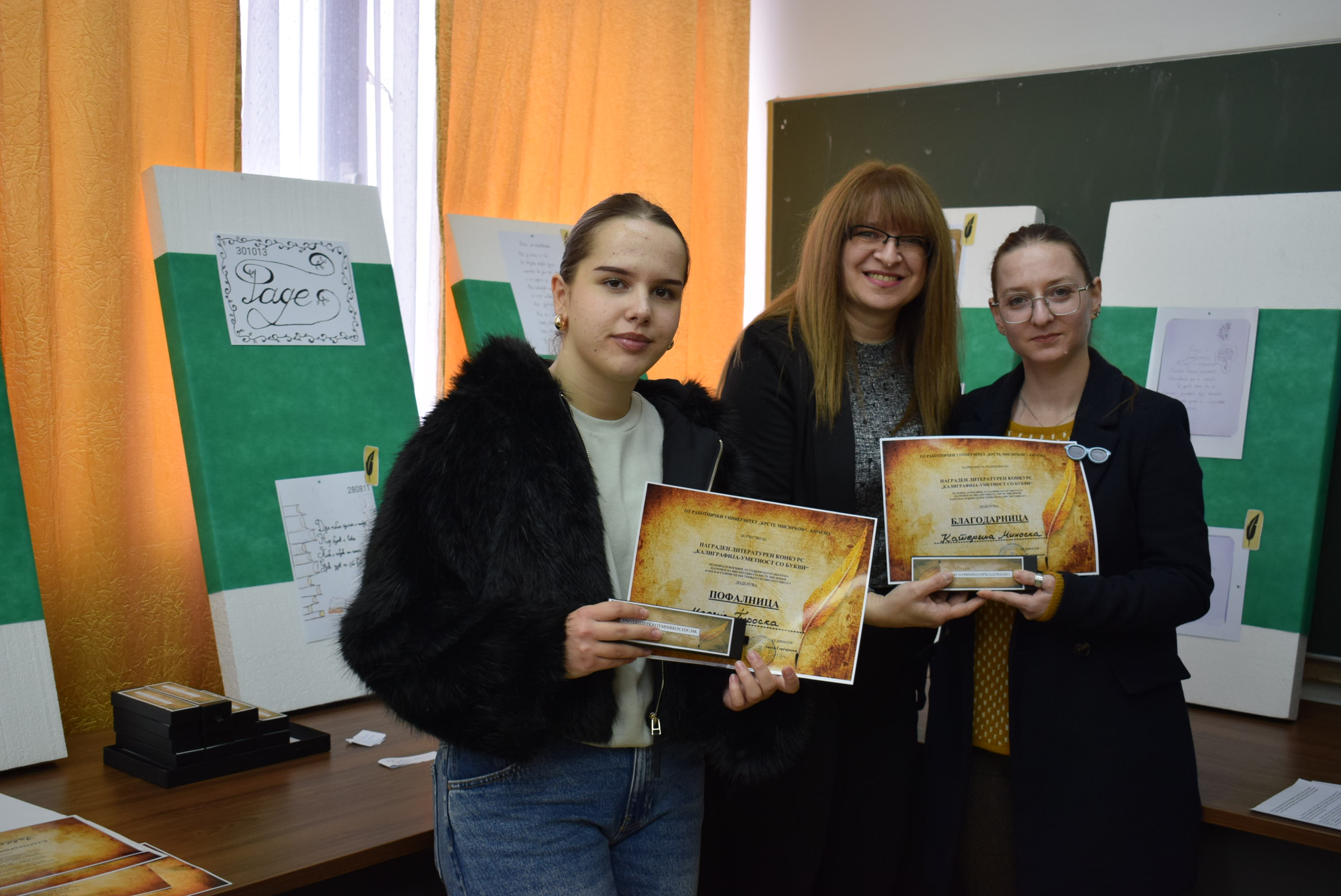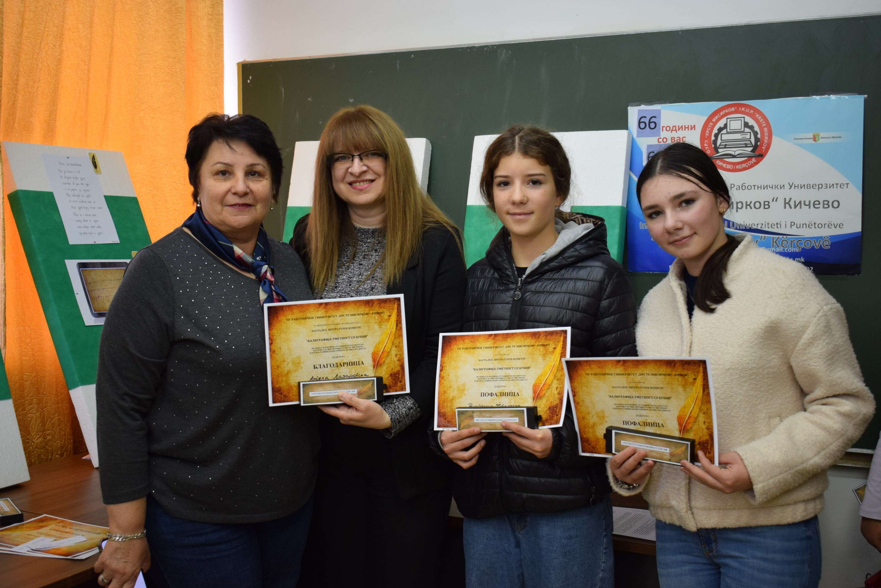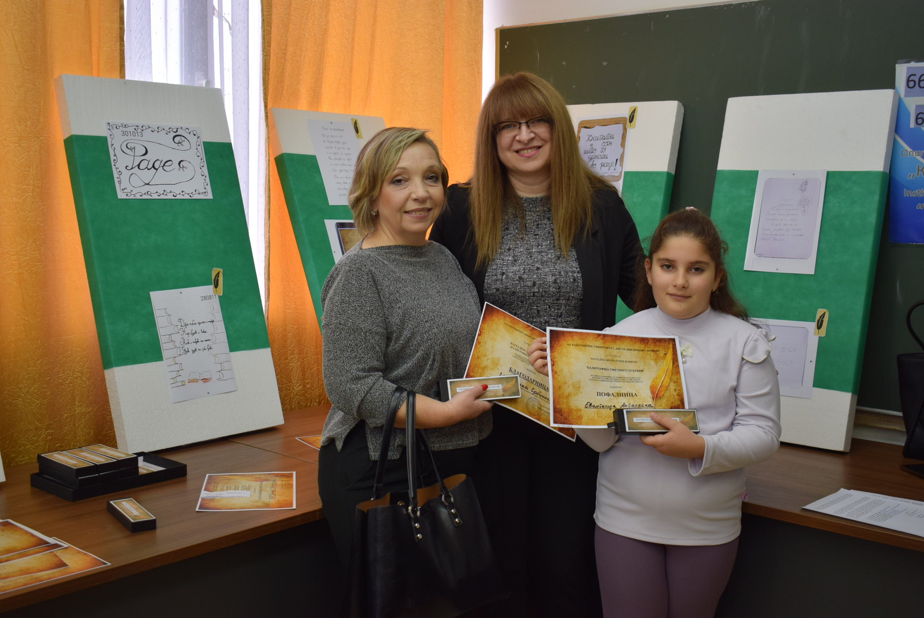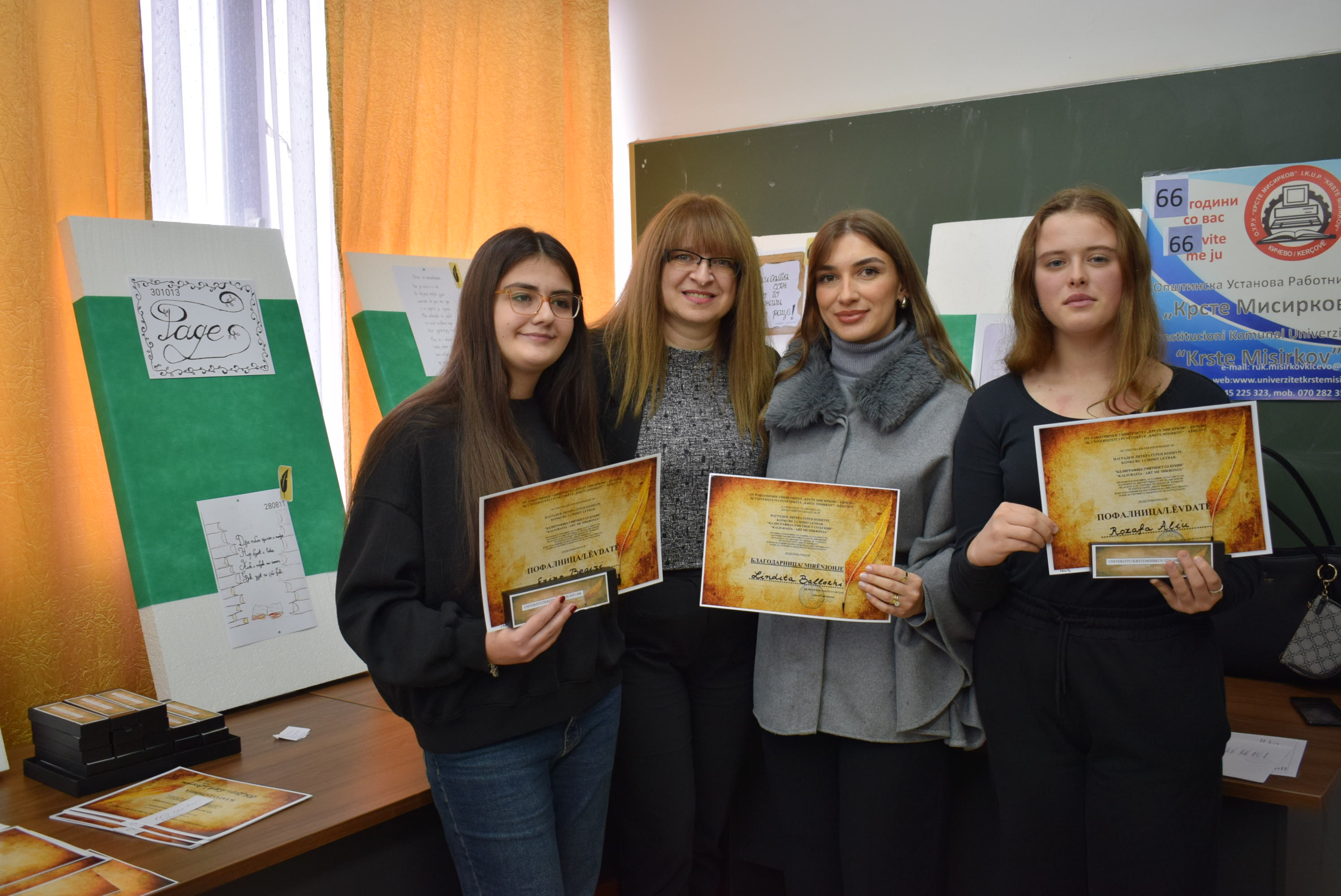 Çmimet dhe lëvdatat u dhanë për veprat më të mira të paraqitura në lidhje me konkursin letrar "Kaligrafia - Art me shkronja". Është një ndjesi e këndshme kur shikon veprat e shkruara me shkronja kaligrafike, të cilat shkruhen më mirë vit pas viti.Shumë faleminderit pjesëmarrësve, mentorëve dhe të gjithë të tjerëve që morën pjesë në këtë aktivitet, i cili ishte me rastin e 151-vjetorit të lindjes së patronit tonë Krste Misirkov, si dhe 66 vjet të ekzistencës së institucionit. Ekspozita do të jetë e hapur për vizitorët për 10 ditët e ardhshme të punës.