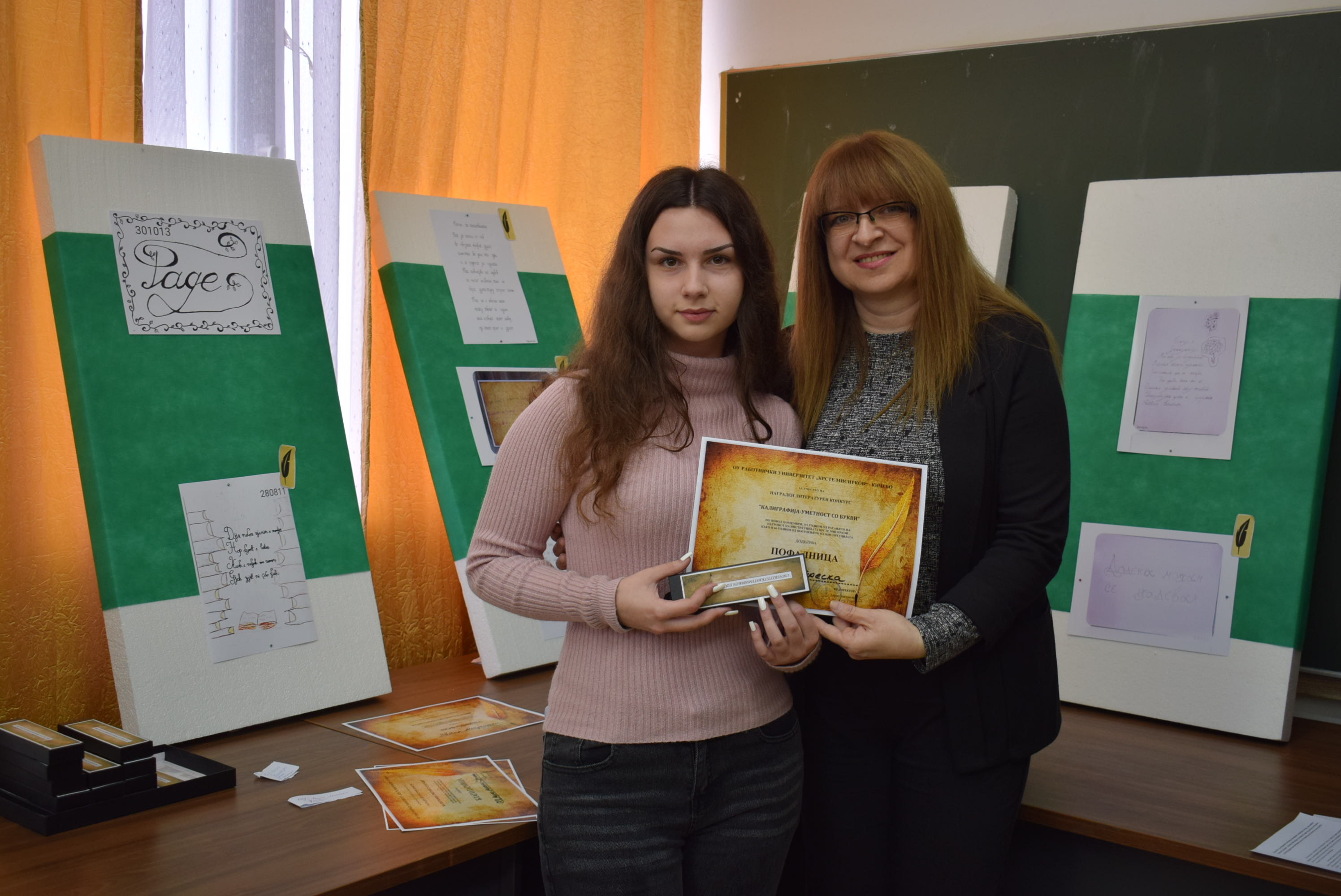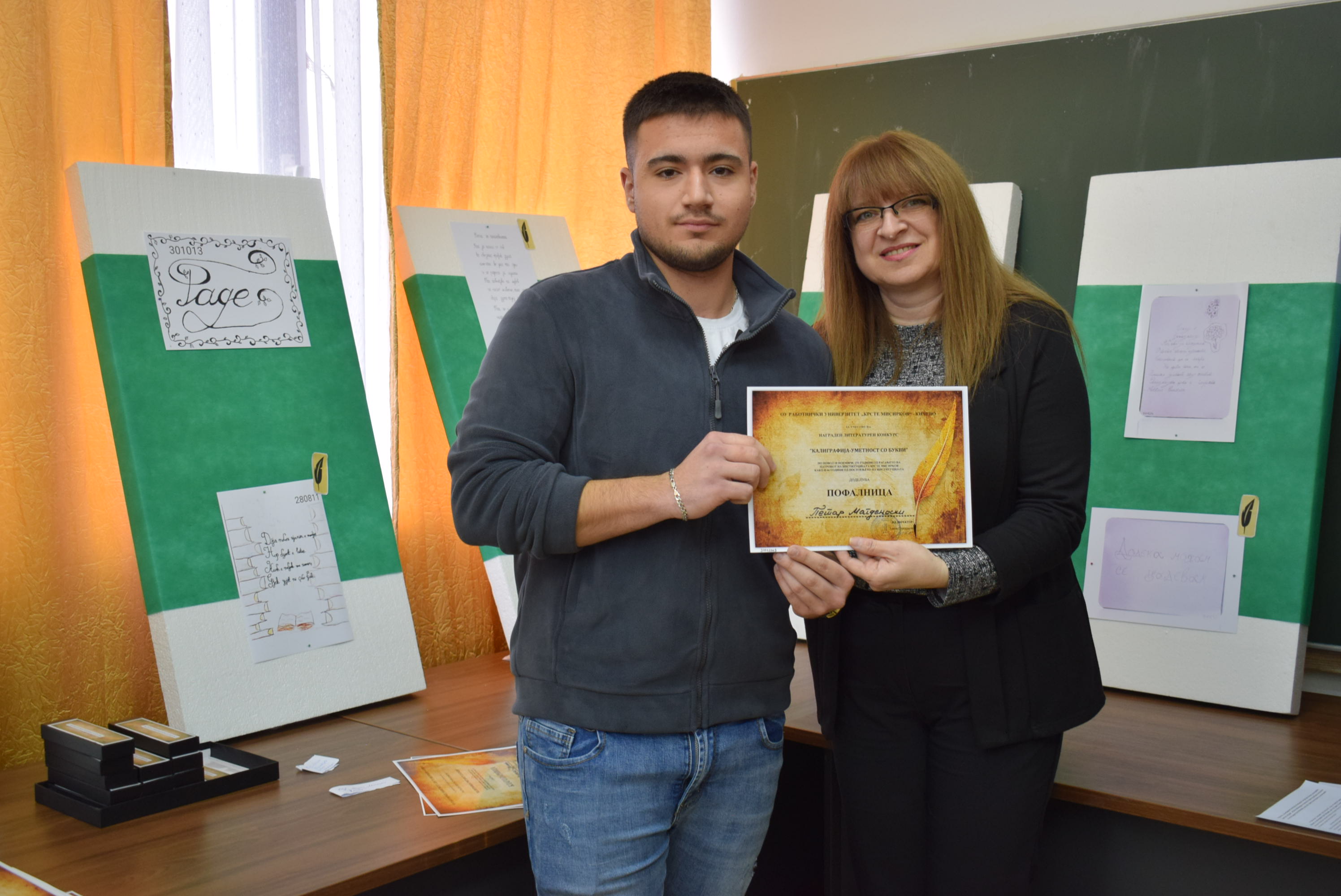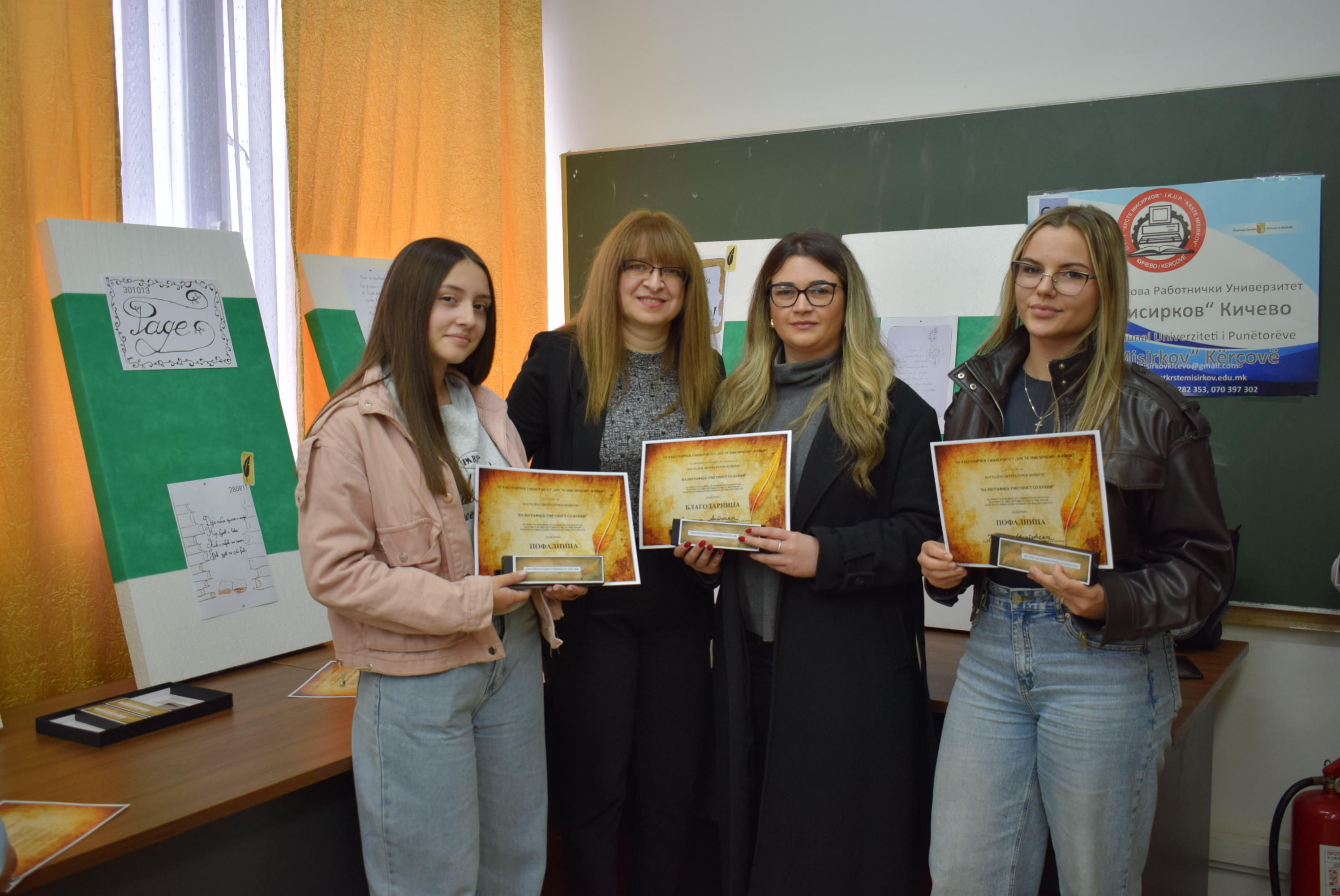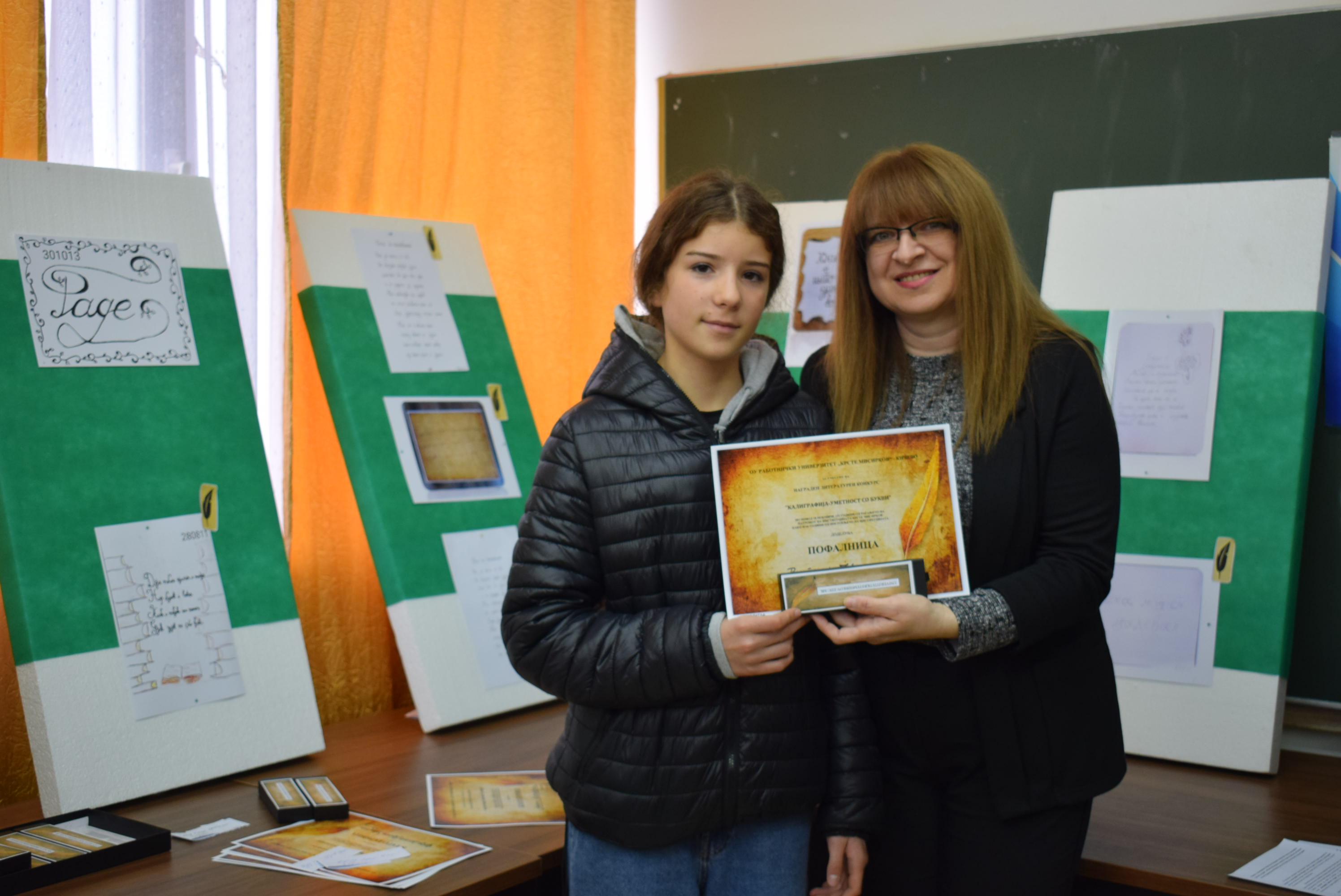 Çmimet dhe lëvdatat u dhanë për veprat më të mira të paraqitura në lidhje me konkursin letrar "Kaligrafia - Art me shkronja". Është një ndjesi e këndshme kur shikon veprat e shkruara me shkronja kaligrafike, të cilat shkruhen më mirë vit pas viti.Shumë faleminderit pjesëmarrësve, mentorëve dhe të gjithë të tjerëve që morën pjesë në këtë aktivitet, i cili ishte me rastin e 151-vjetorit të lindjes së patronit tonë Krste Misirkov, si dhe 66 vjet të ekzistencës së institucionit. Ekspozita do të jetë e hapur për vizitorët për 10 ditët e ardhshme të punës.